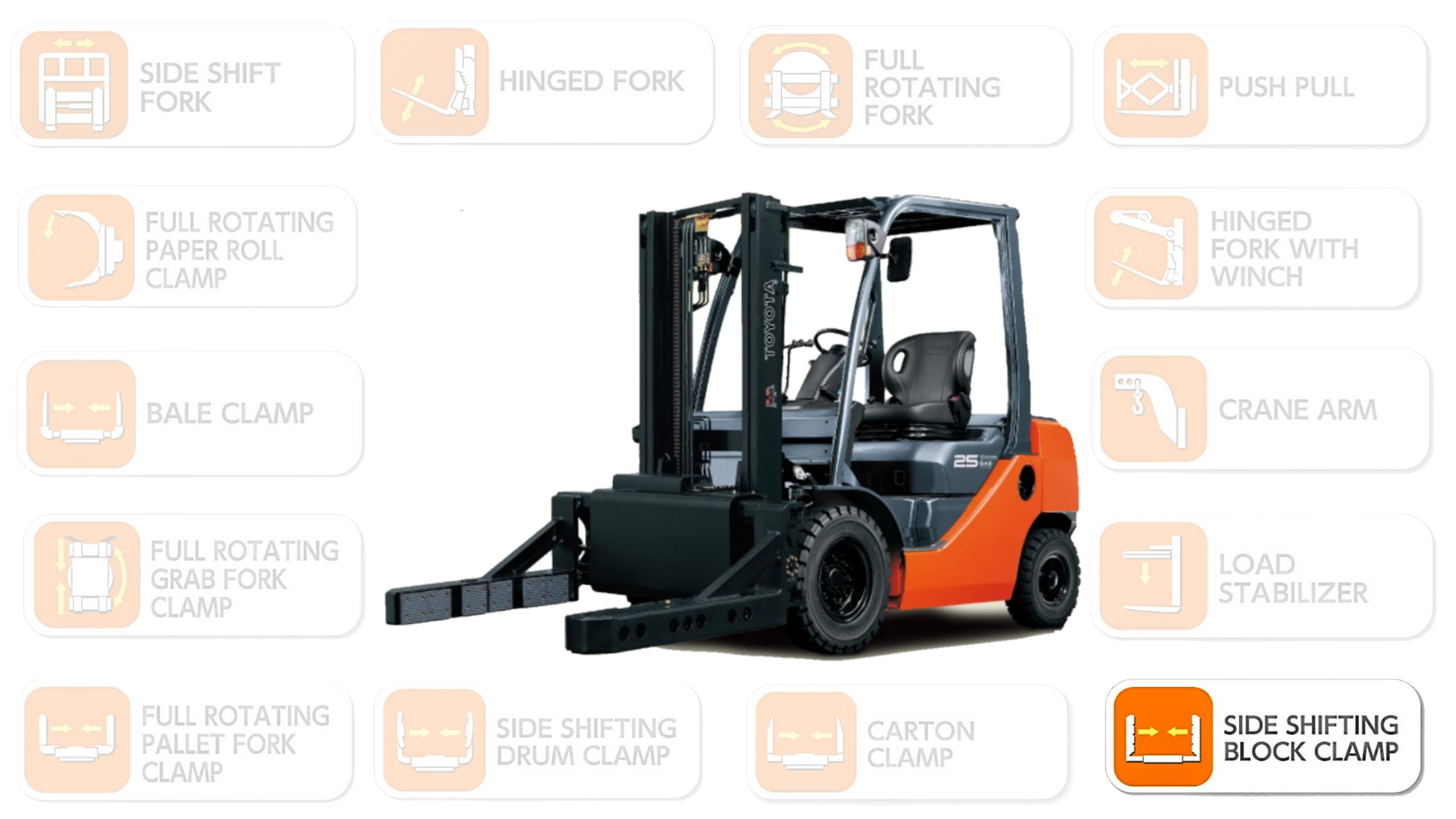 Block Clamp Attachment terdiri dari sebuah alat yang terpasang pada forklift. Alat ini memiliki cengkeram yang dapat memegang beban dan memindahkannya. Cengkeram ini dapat disesuaikan untuk memegang beban dengan baik dan memastikan bahwa beban tidak jatuh atau tergelincir saat dipindahkan.