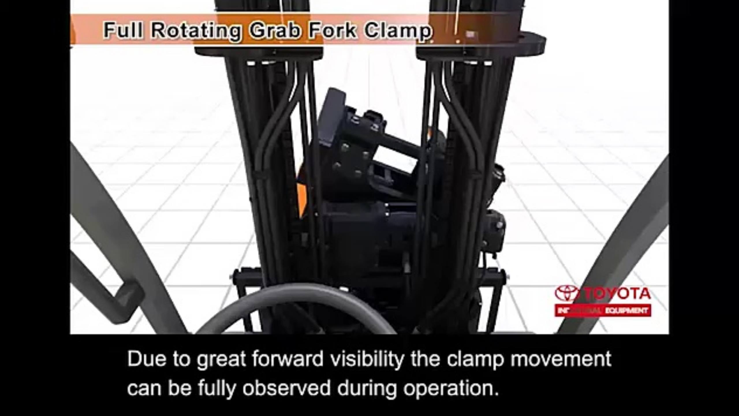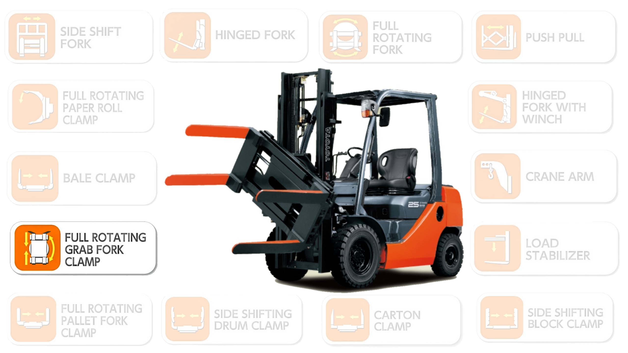 Grab Clamp Attachment terdiri dari sebuah alat yang terpasang pada forklift. Alat ini memiliki dua cengkeram yang memegang beban dan membantu memindahkan beban dengan mudah dan efisien. Cengkeram ini dapat dibuka dan ditutup secara elektrik untuk memegang dan melepaskan beban.