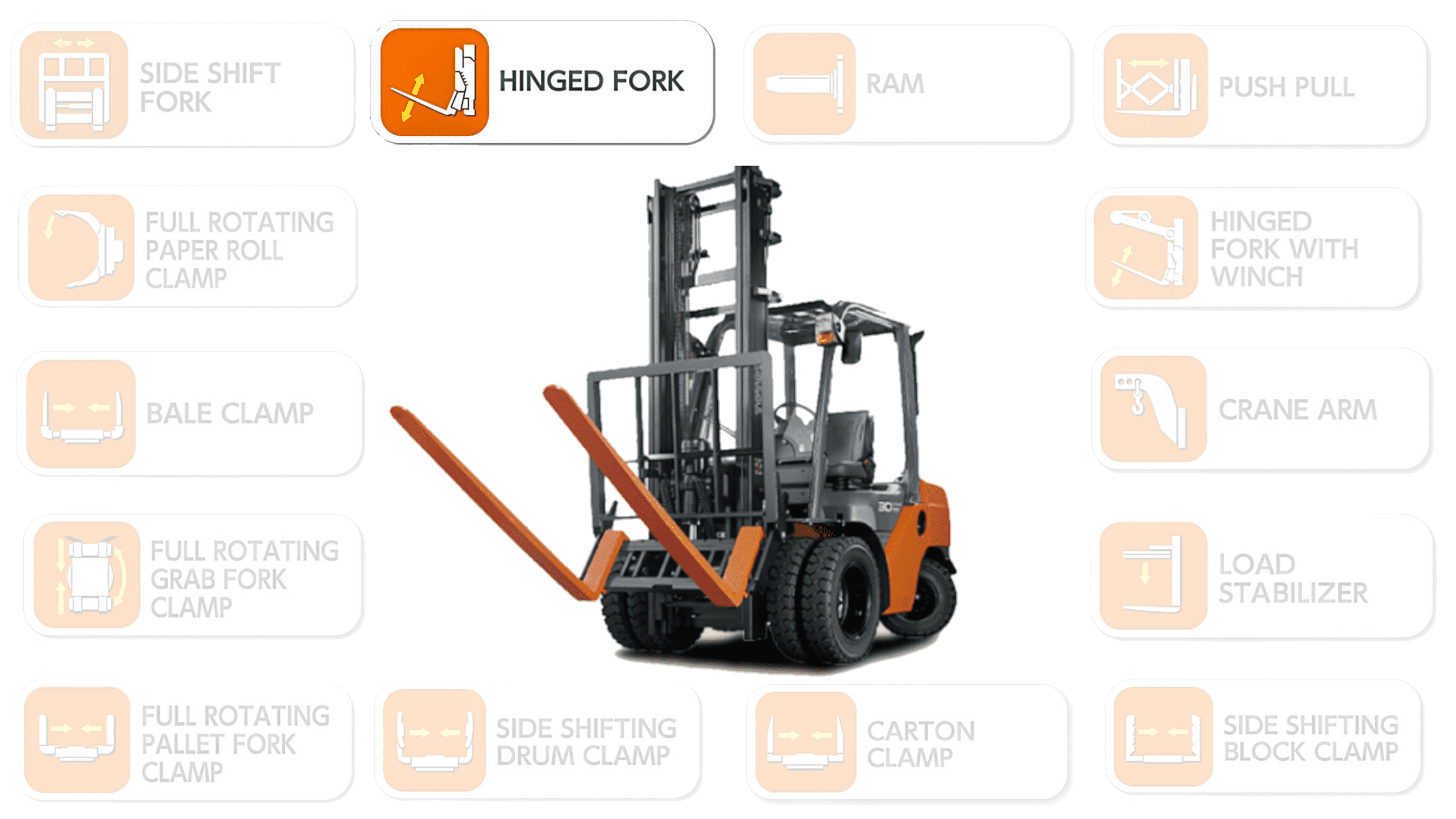 Hinged Fork Attachment tersedia dalam berbagai ukuran dan kapasitas, sehingga dapat ditemukan sesuai dengan kebutuhan setiap aplikasi. Ini juga dapat dikustomisasi untuk memenuhi spesifikasi khusus.