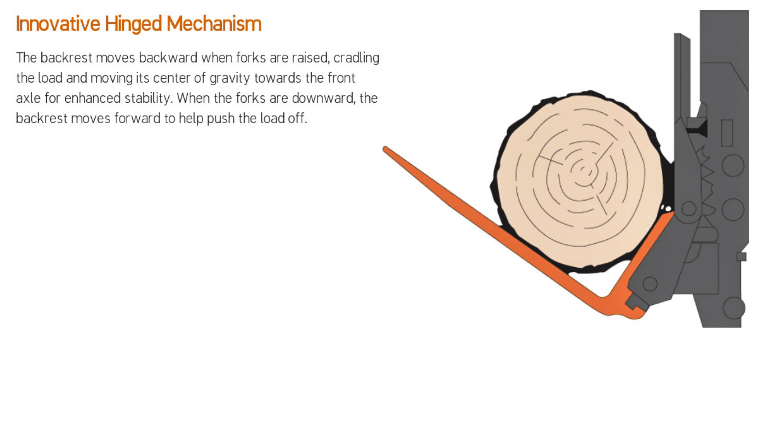 Hinged Fork Attachment terdiri dari dua tines yang terhubung dengan sebuah hinge. Tines ini dapat dibuka atau ditutup dengan mengendalikan tombol hidrolik. Ini memungkinkan operator untuk memindahkan beban dengan lebih mudah dan memastikan bahwa beban tersebar secara merata dan aman, mengurangi risiko kerusakan pada barang dan juga memastikan keselamatan operator.