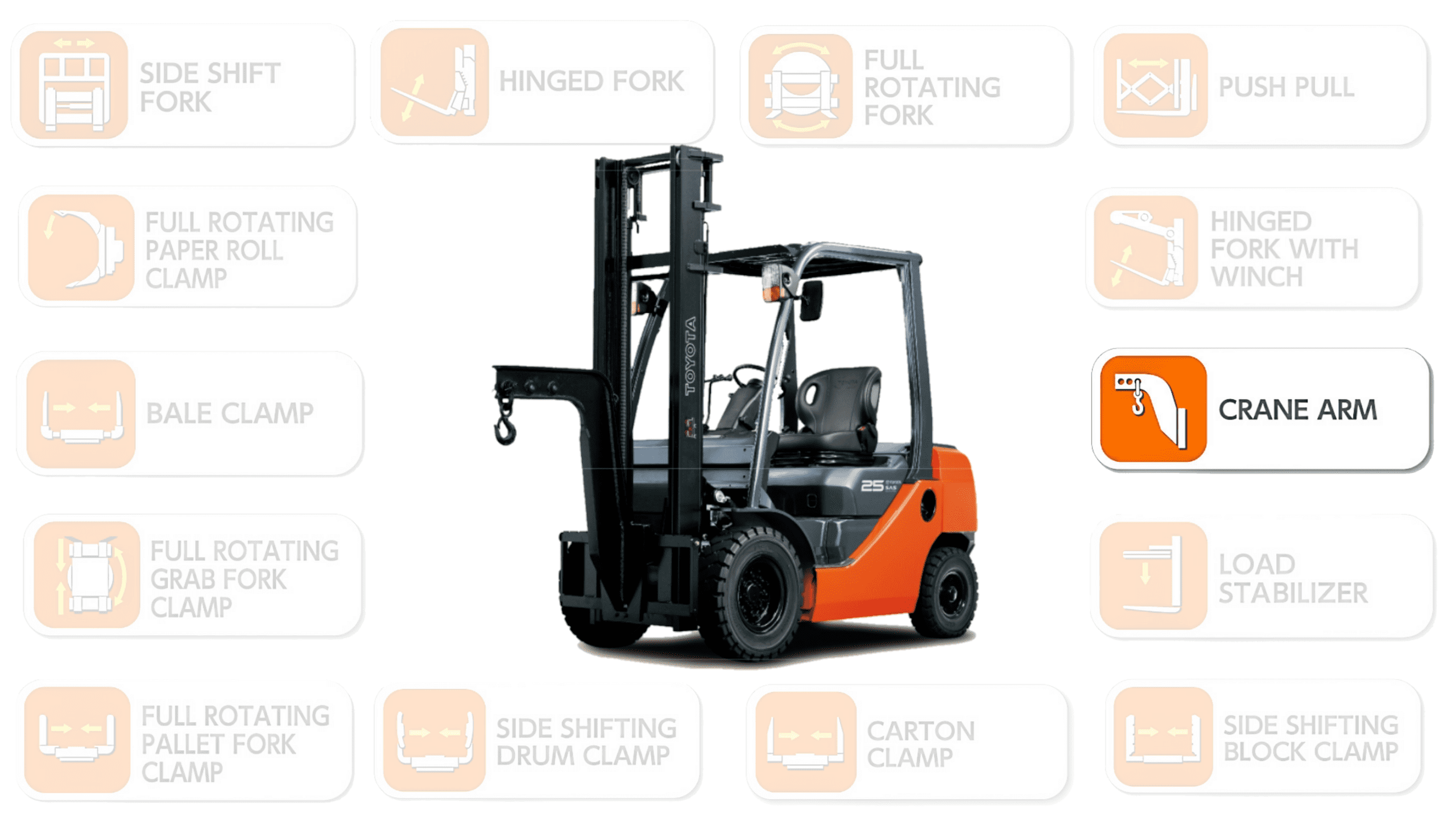 Jib Crane Attachment adalah perangkat tambahan pada forklift yang digunakan untuk membantu memindahkan beban yang berat atau sulit dipindahkan. Ini memungkinkan operator untuk memindahkan beban dengan lebih mudah dan memastikan bahwa beban tersebar secara merata dan aman.