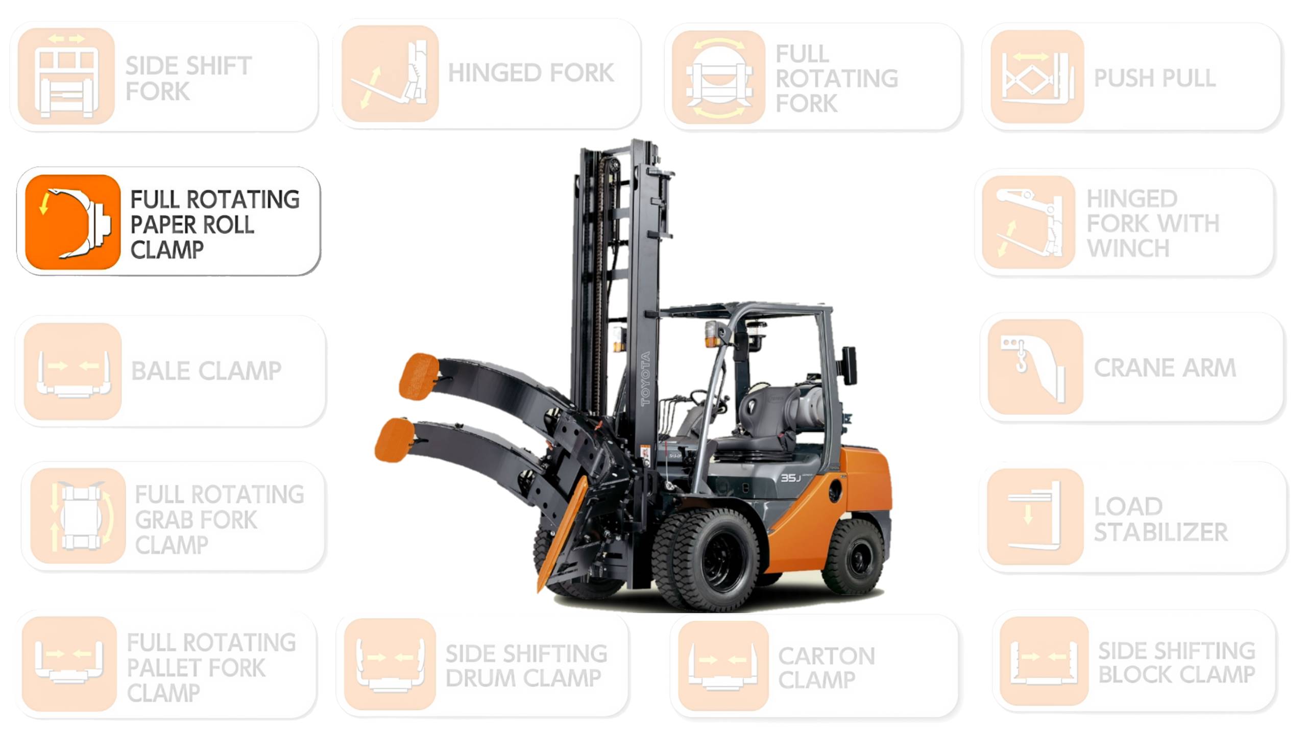 Attachment ini terdiri dari sebuah alat yang terpasang pada forklift. Alat ini memiliki cengkeram yang dapat memegang roll kertas dan memindahkannya. Cengkeram ini dapat disesuaikan untuk memegang roll kertas dengan baik dan memastikan bahwa roll kertas tidak jatuh atau tergelincir saat dipindahkan.