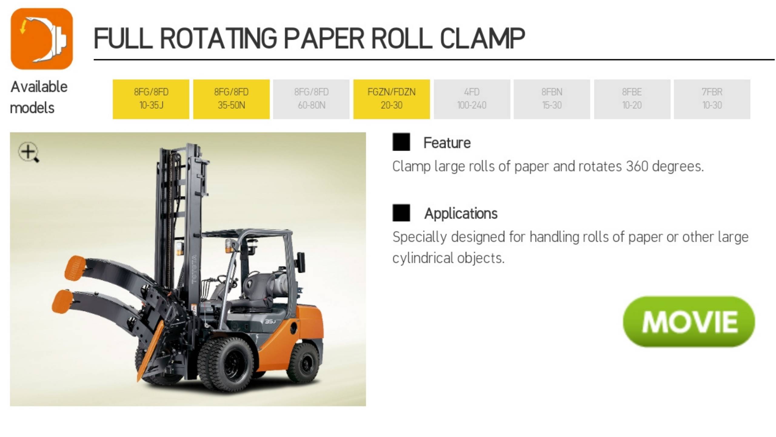 Paper Rol Clamp Attachment tersedia dalam berbagai ukuran dan kapasitas, sehingga dapat ditemukan sesuai dengan kebutuhan setiap aplikasi. Ini juga dapat dikustomisasi untuk memenuhi spesifikasi khusus.
