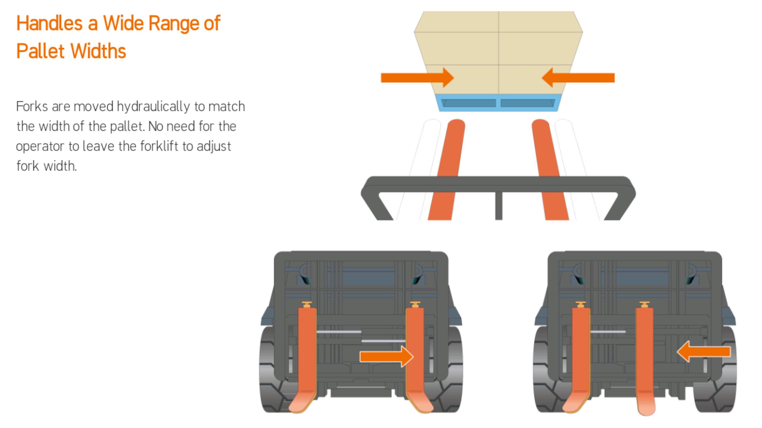 Attachment sideshifter memiliki dua lengan yang bergerak secara hidrolik untuk memindahkan fork ke samping. Ini memungkinkan operator untuk memindahkan muatan dengan cepat dan efisien, tanpa harus memutar forklift dan mengurangi waktu yang dibutuhkan untuk memindahkan muatan.